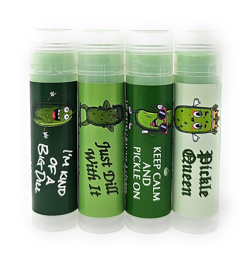 Features Four Dill Pickle Lip Balms with Different Pickle Characters and pickle puns: