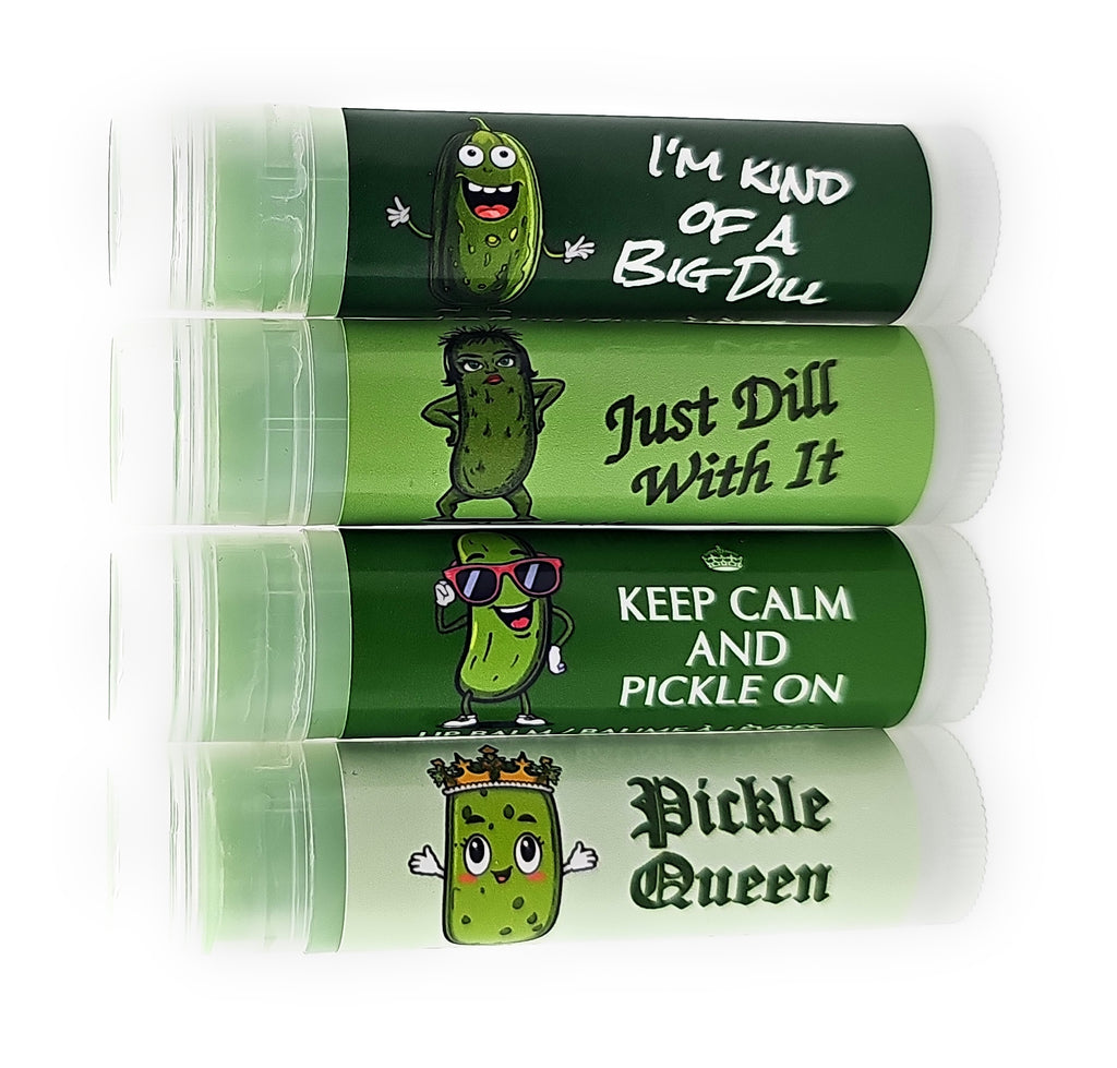 ~.. Dill Pickle: Four Pack of Giftable Dill Pickle Puns Version 1 Flavoured Lip Balm
